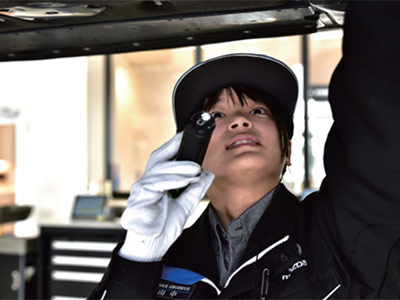 整備職の使命は、確かな技術でマツダ車の安全を守り抜くことです。修理作業だけでなく、お客様への問診や整備内容のご説明など、対面でのコミュニケーションも大切にしています。 技術面では、約2か月の新人研修で基礎を固め、配属後も月1回のフォロー研修で着実にスキルアップできる育成プログラムを完備しています。